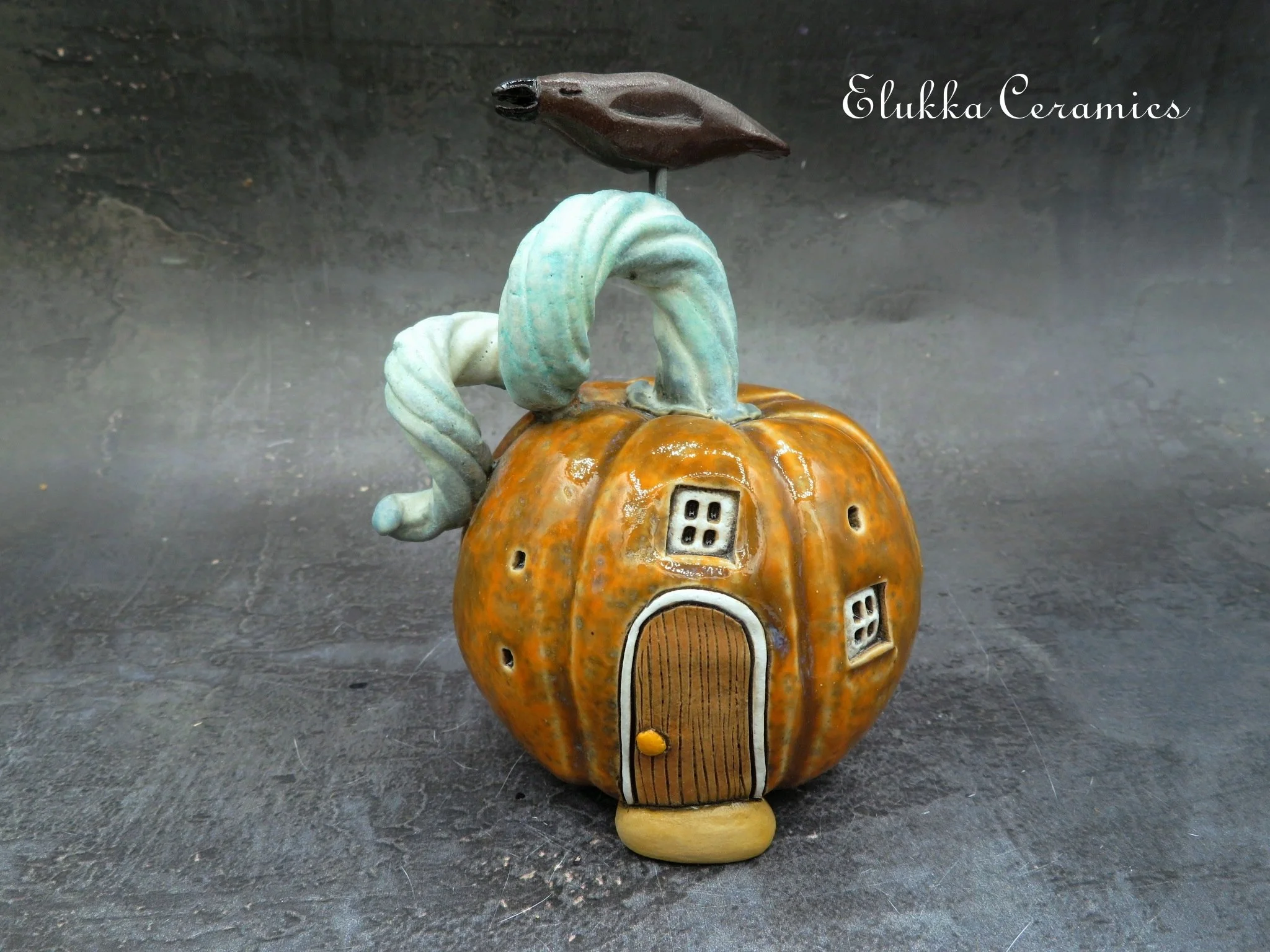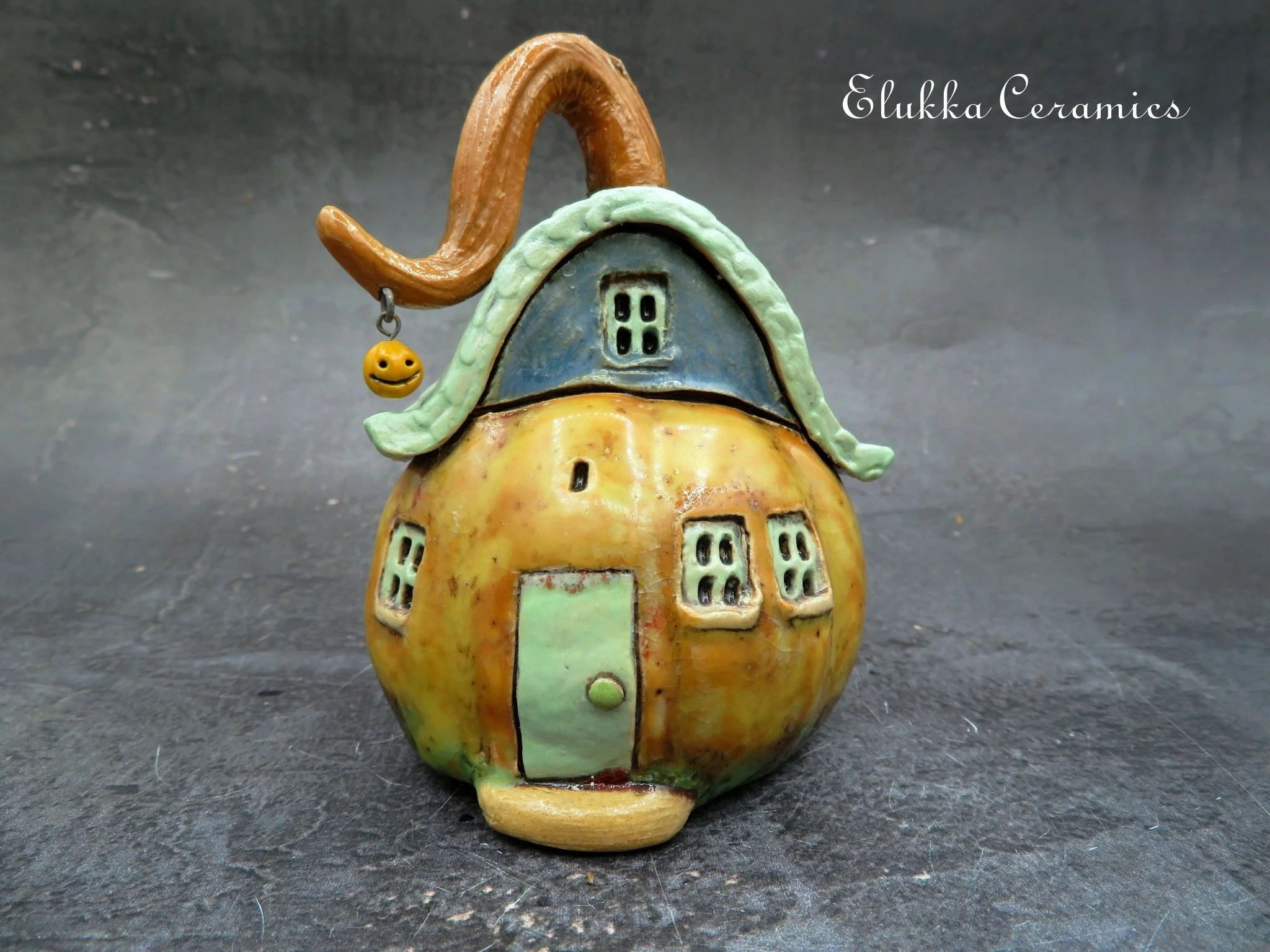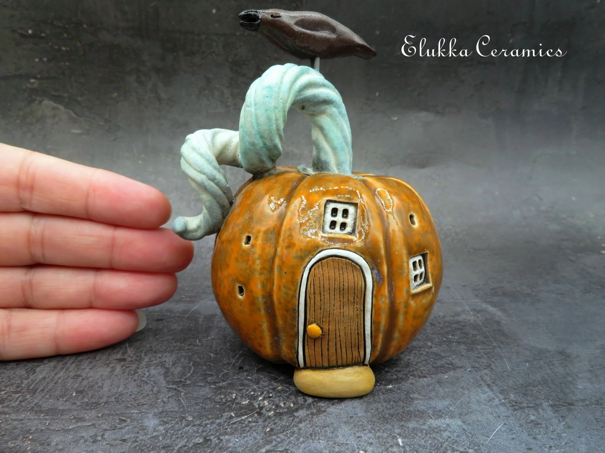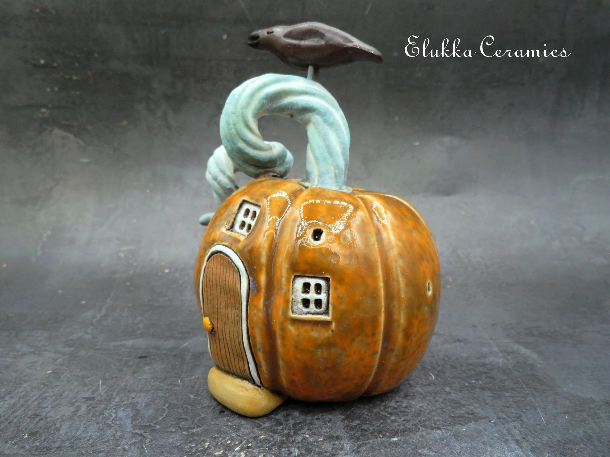Add a touch of autumn magic to your home with this handcrafted ceramic pumpkin cottage.