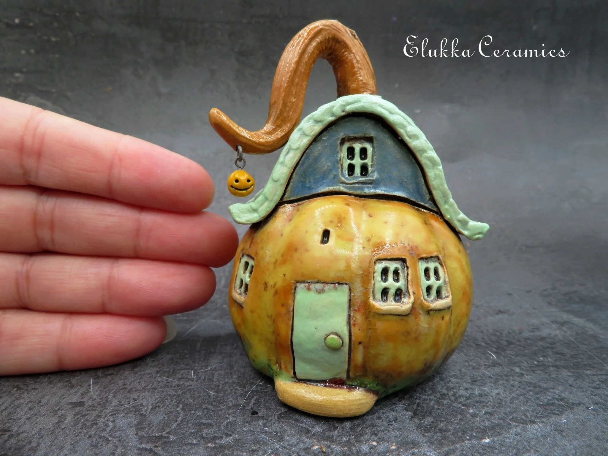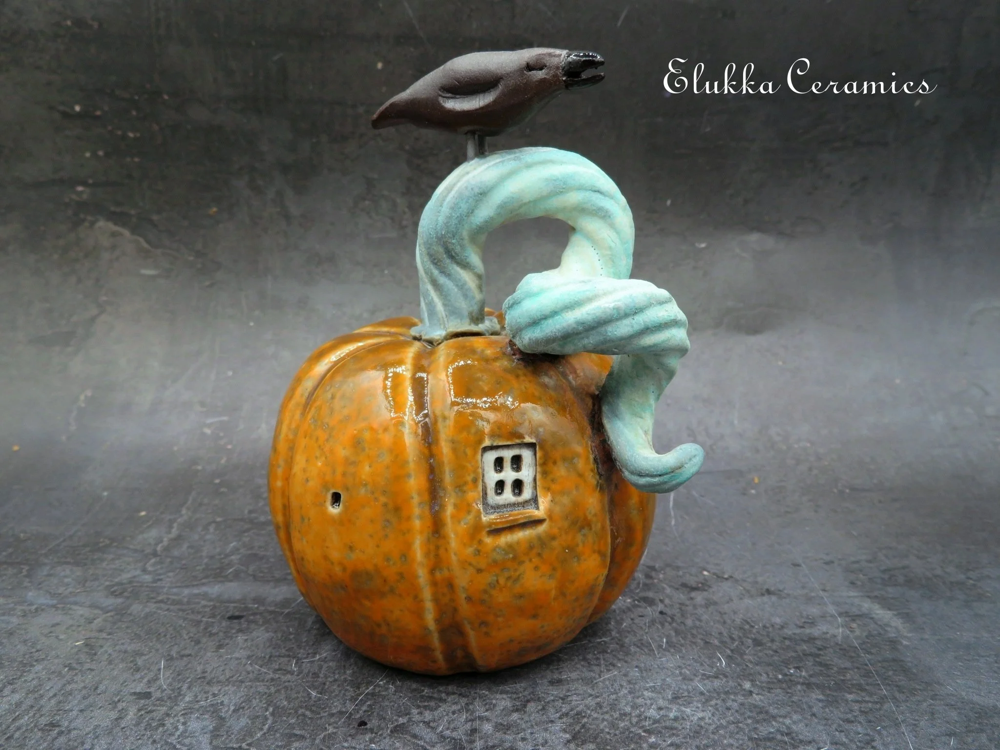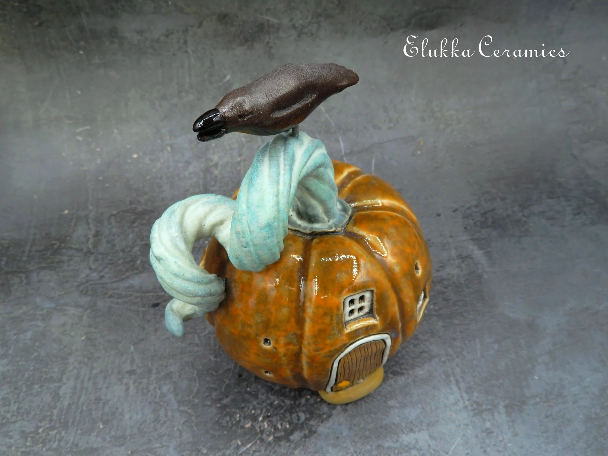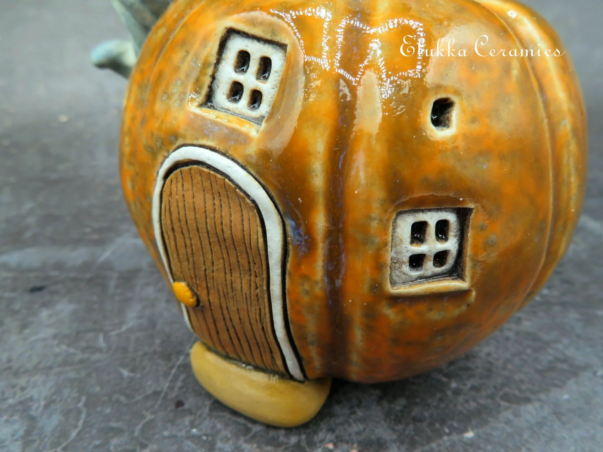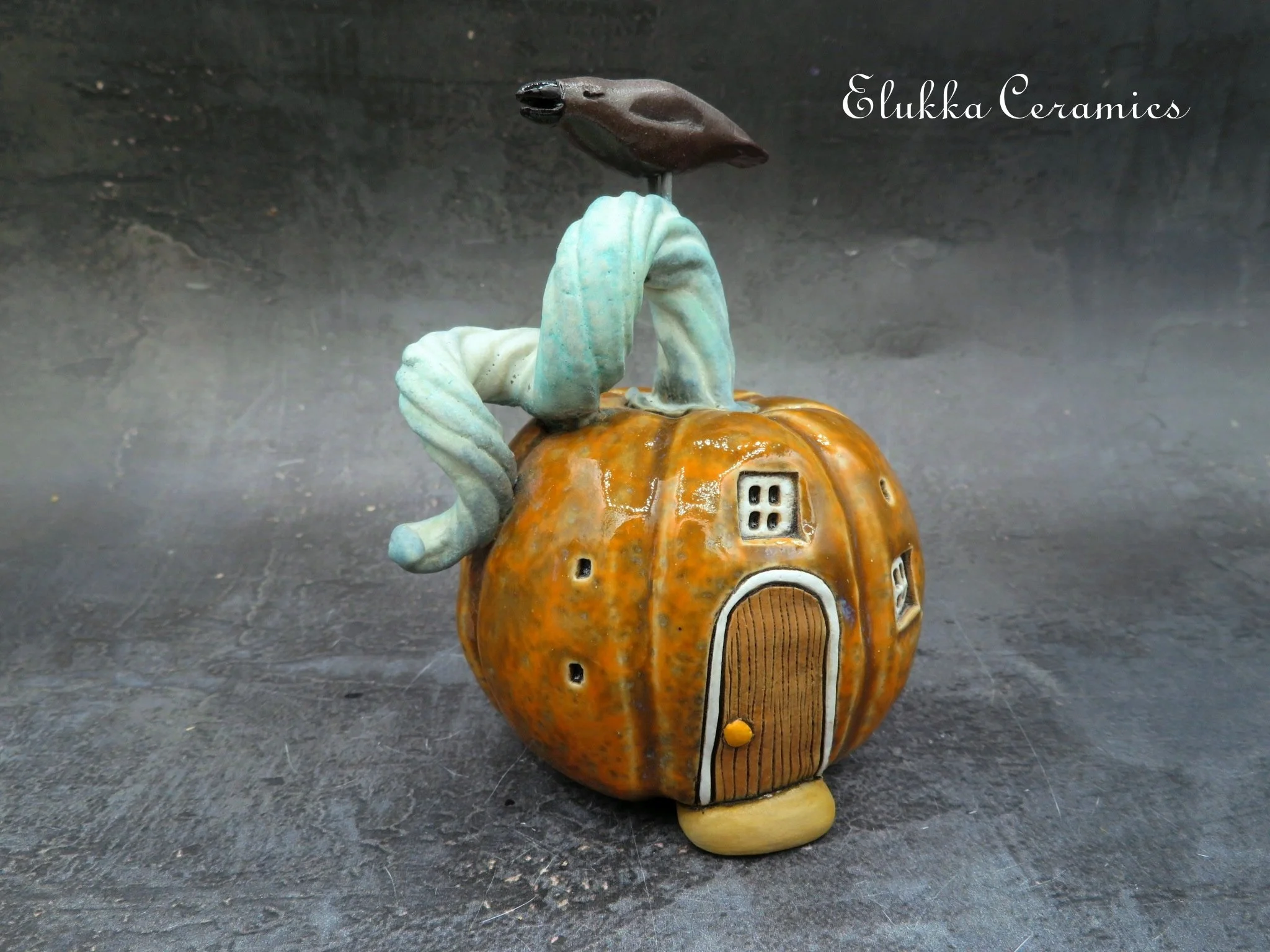 Add a touch of autumn magic to your home with this handcrafted ceramic pumpkin cottage.