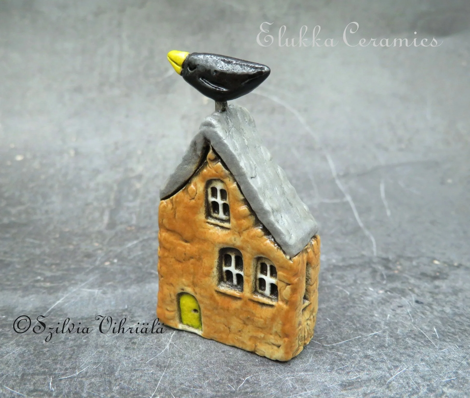 Collectible TINY Mediterranean Town House in Stoneware by elukka #38...Dark Grey House w/ BlackBird