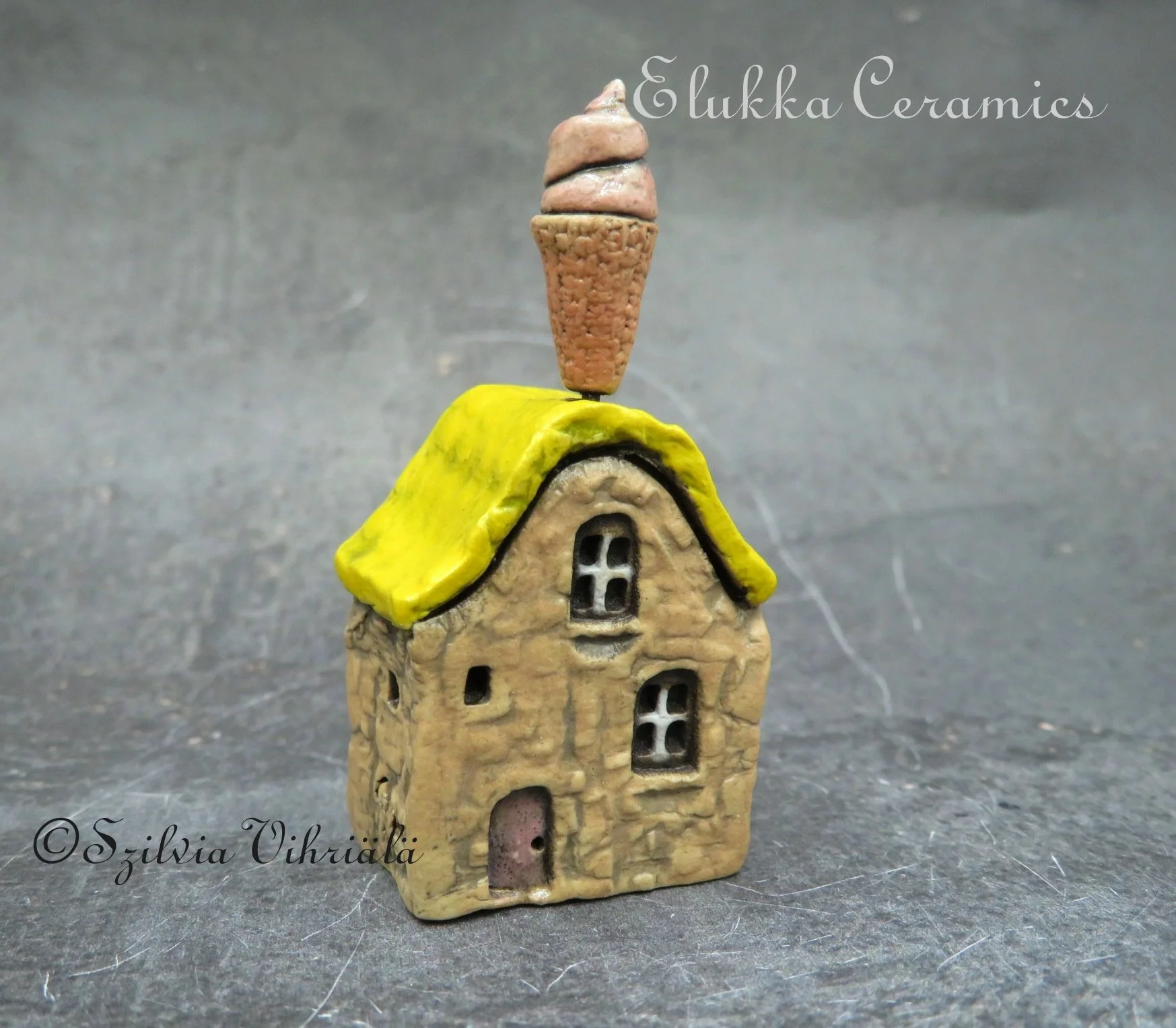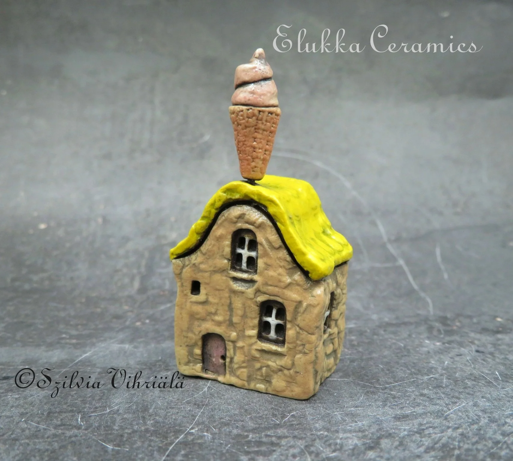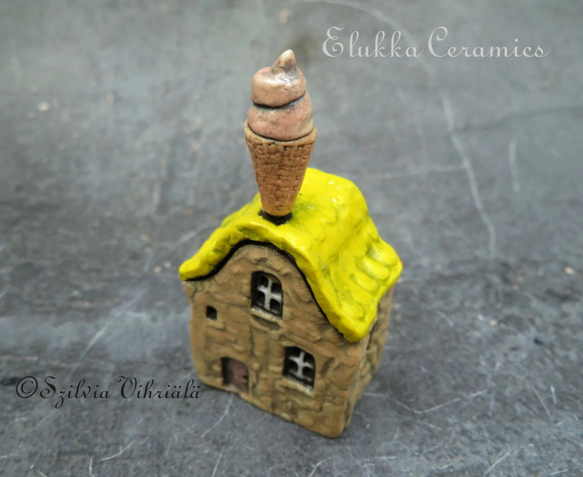 This tiny ceramic house stands just 4.2 cm ( 1.7 inches) tall and is signed with my initials (Sz) on one side wall.