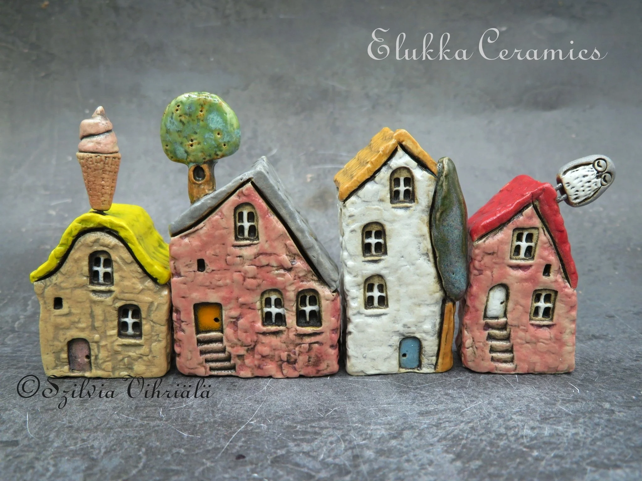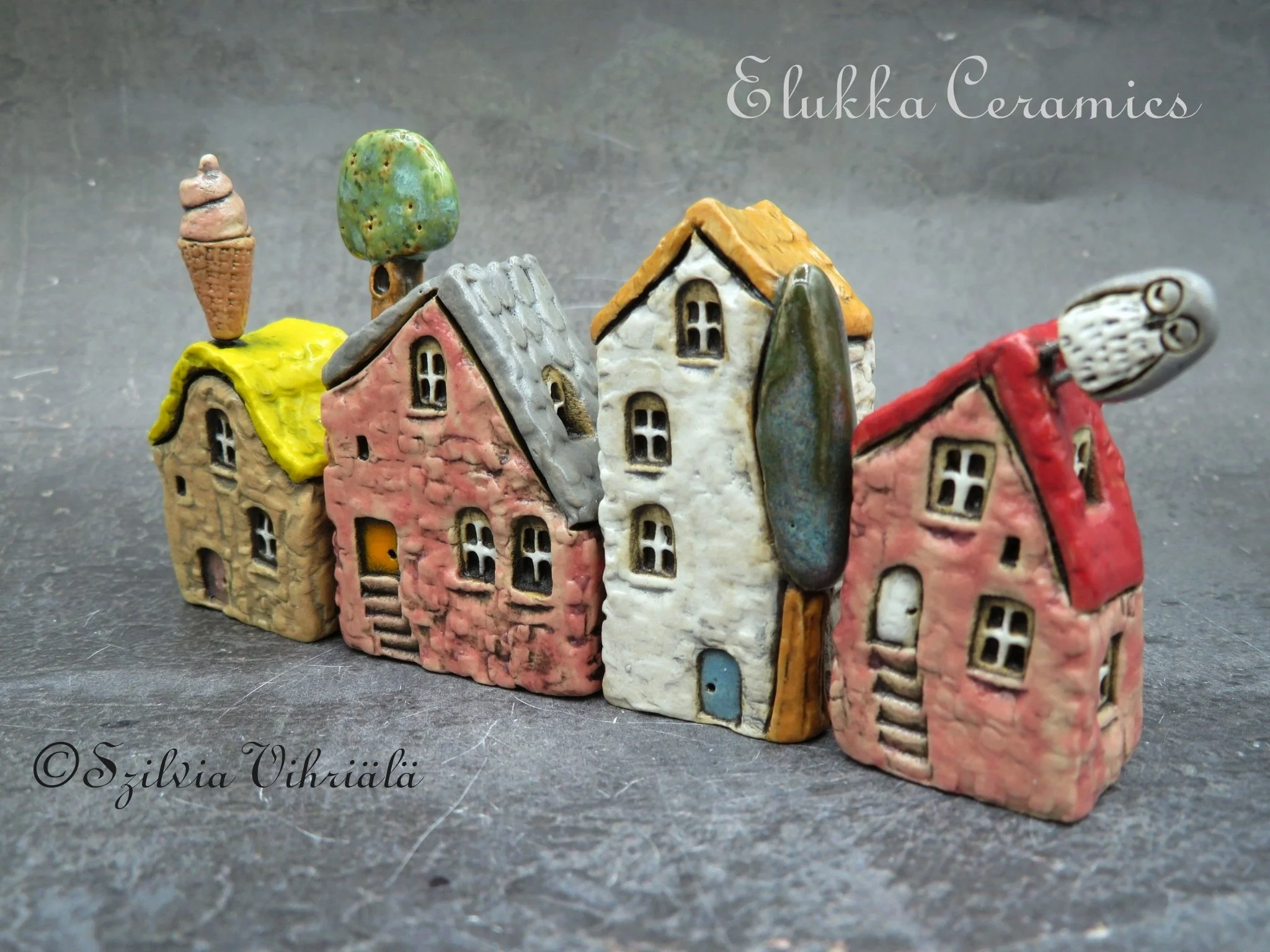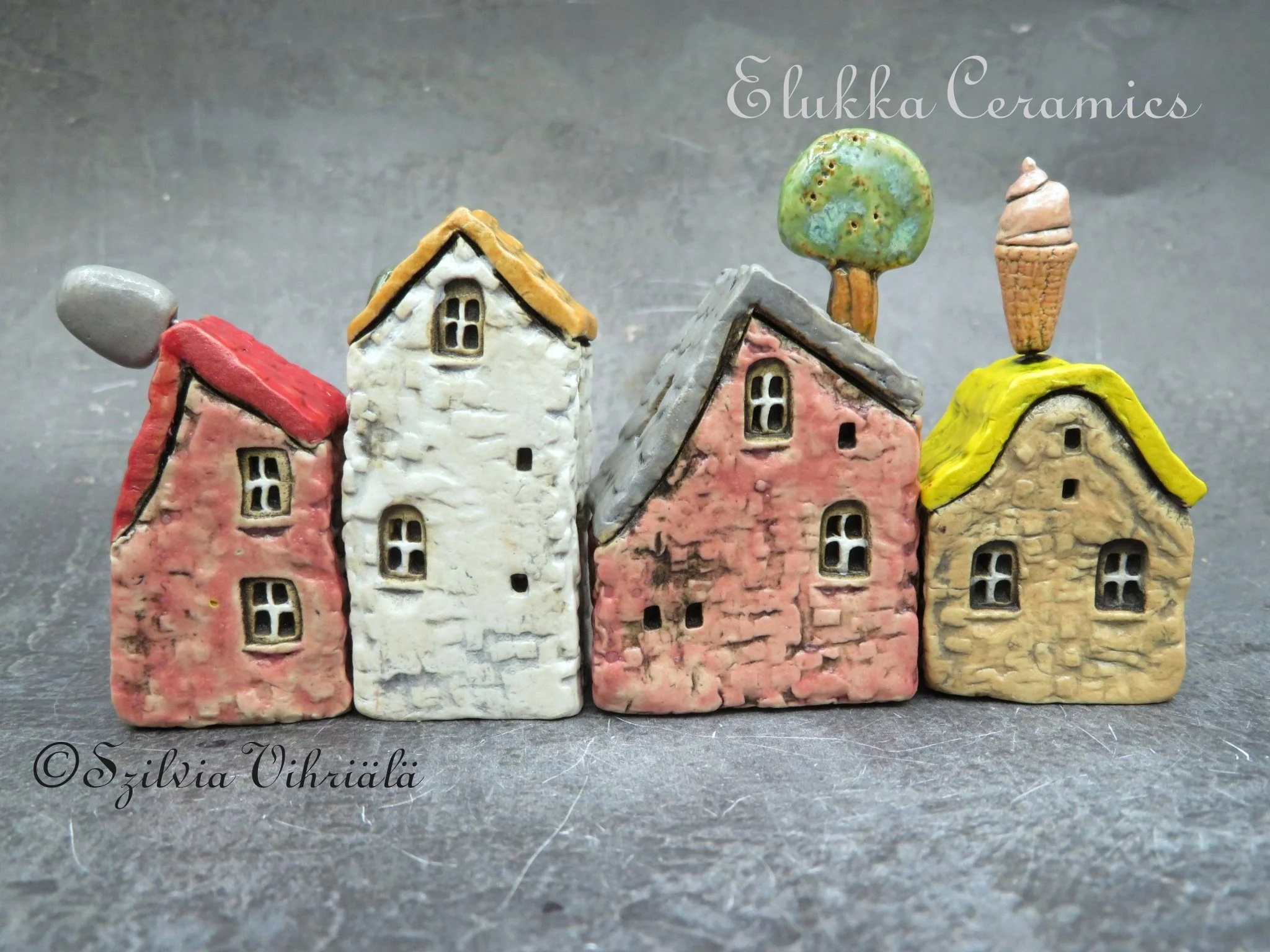 Each one is crafted from high-fired stoneware clay and fired in my giant electric kiln to at least 1240°C / 2264°F — sometimes even hotter! At those temperatures, the clay vitrifies completely, making the houses super strong and rock hard.