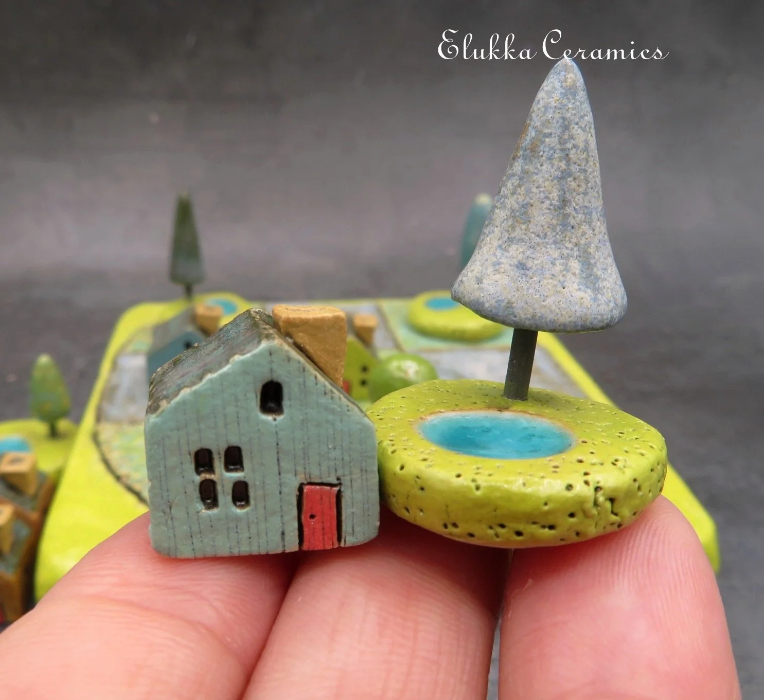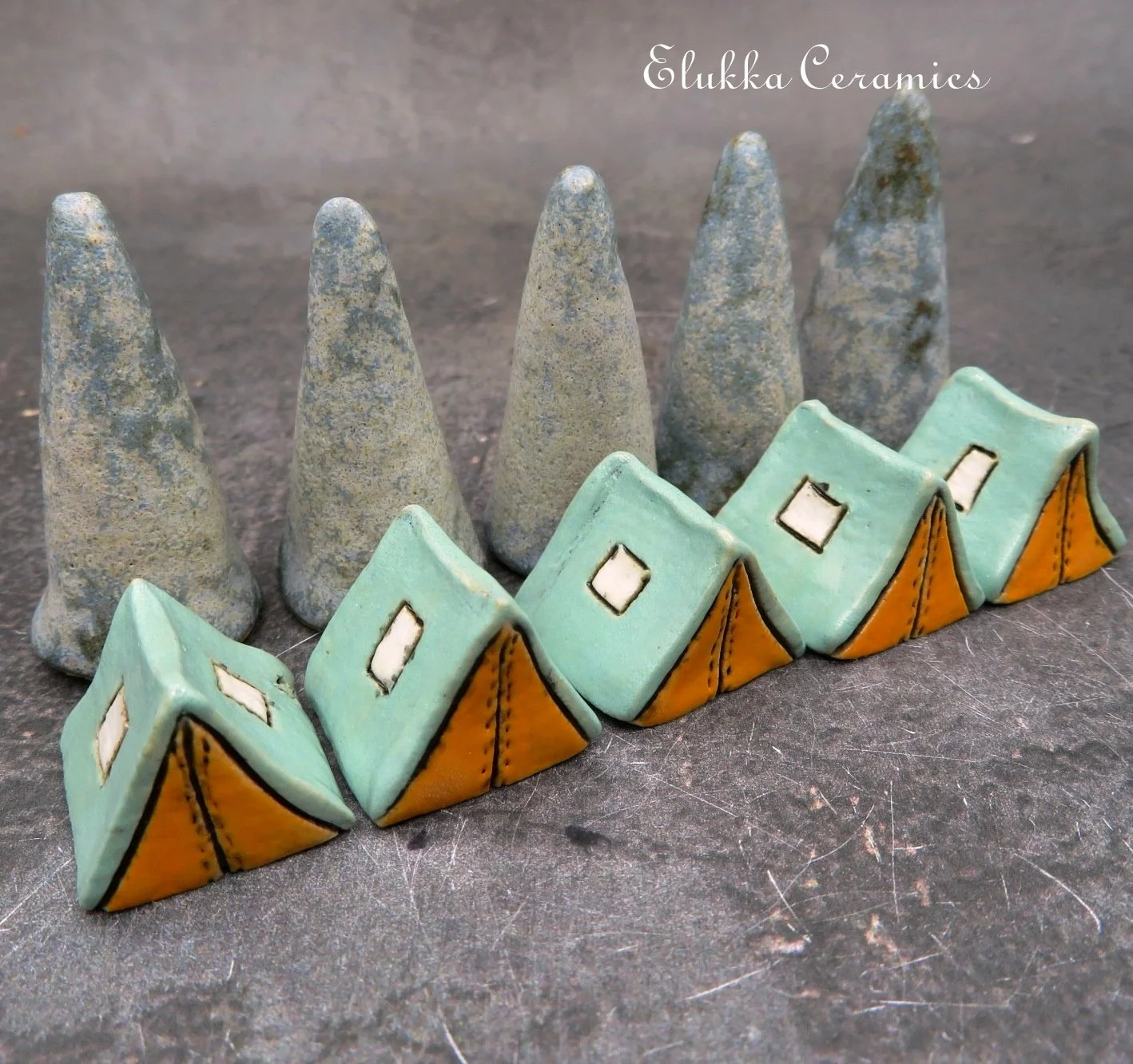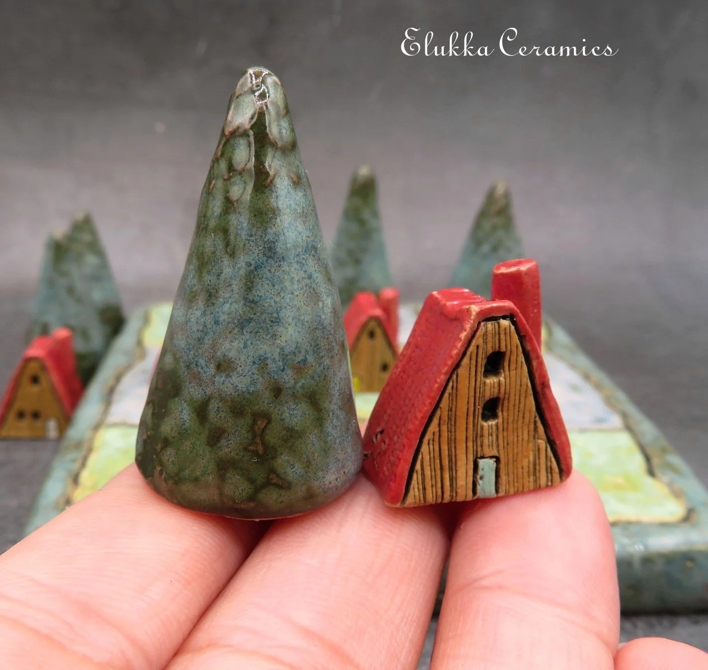 Included are five tiny gingerbread cottages & five snowy pine trees, each meticulously hand-painted with intricate details.