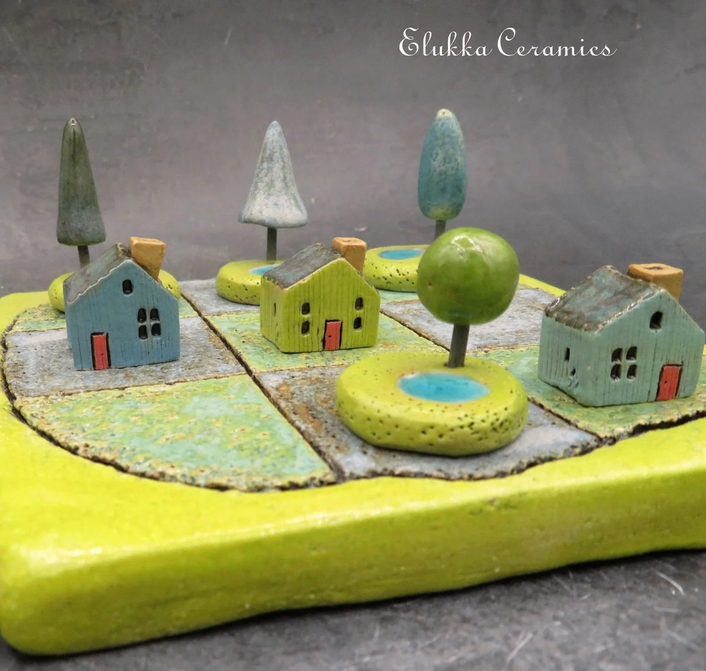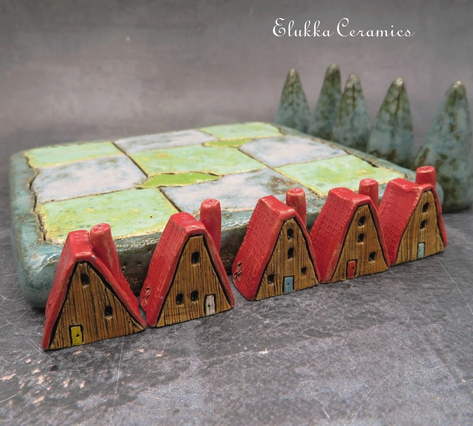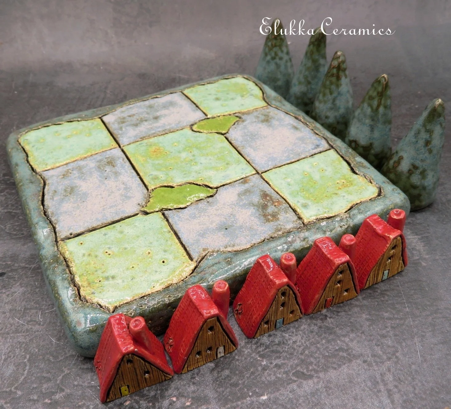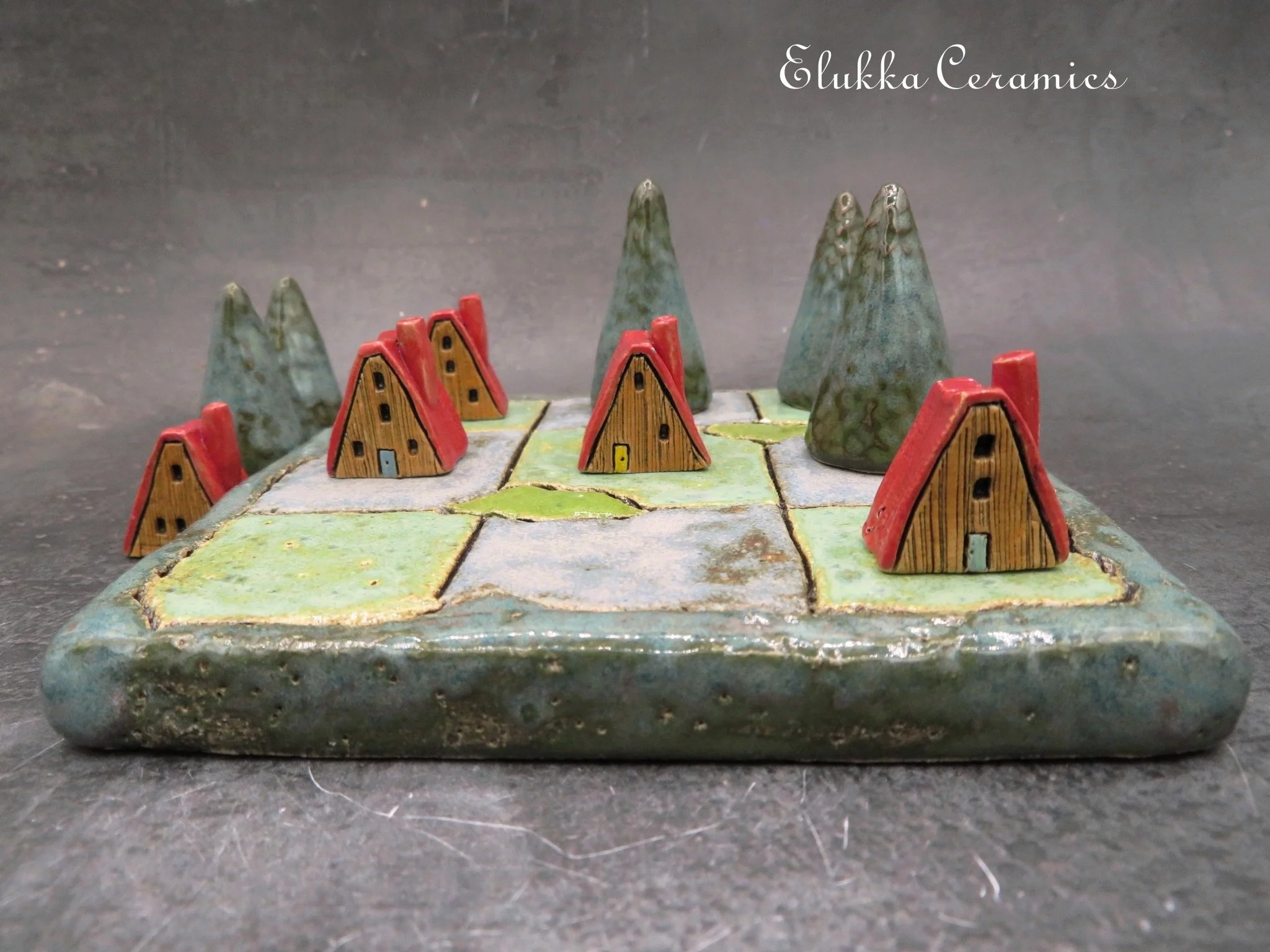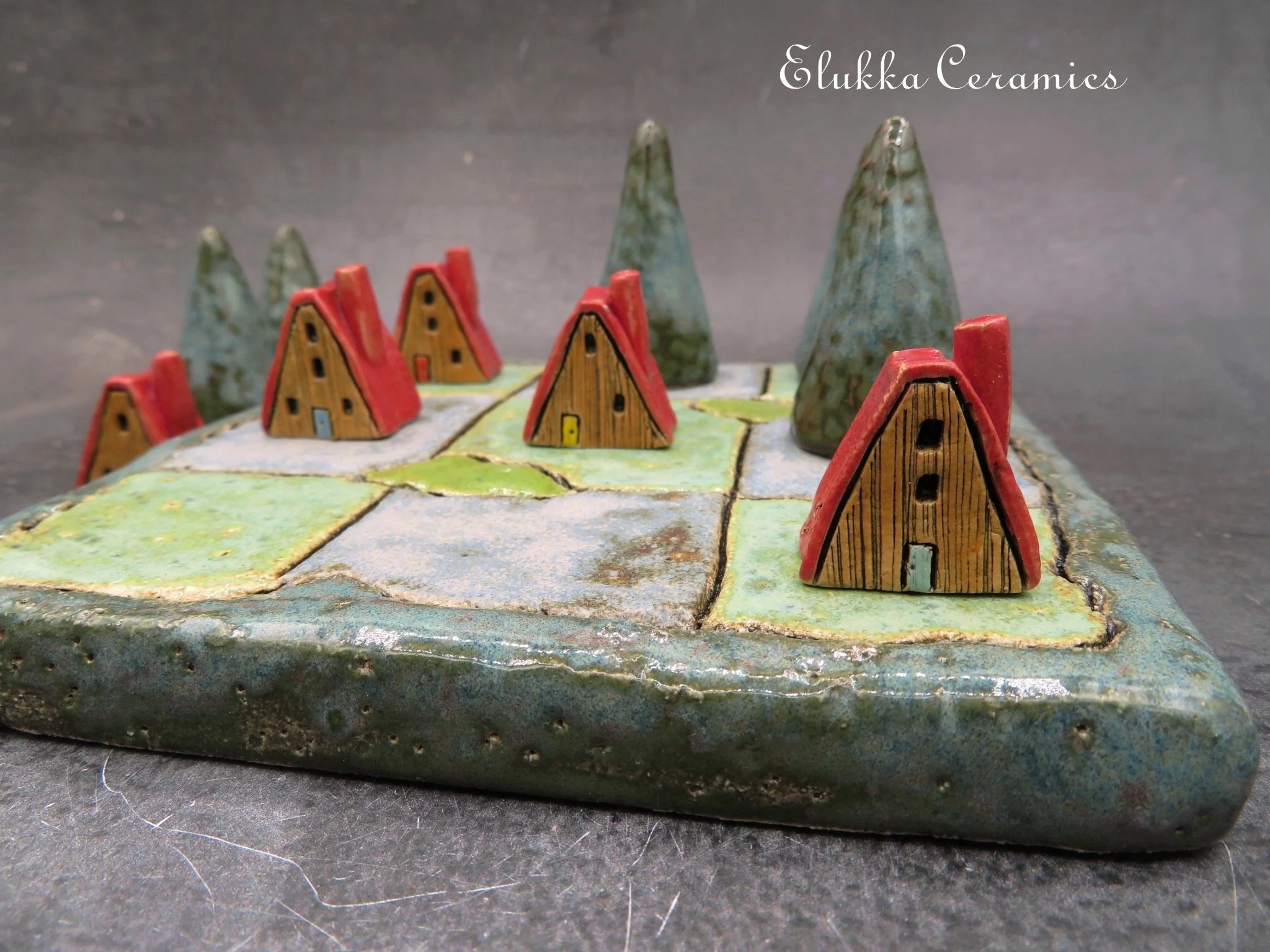 Winter Holiday...Miniature TiC-TaC-ToE Game Set in Stoneware ...Gingerbread Cottages vs. Snowy Pine Trees